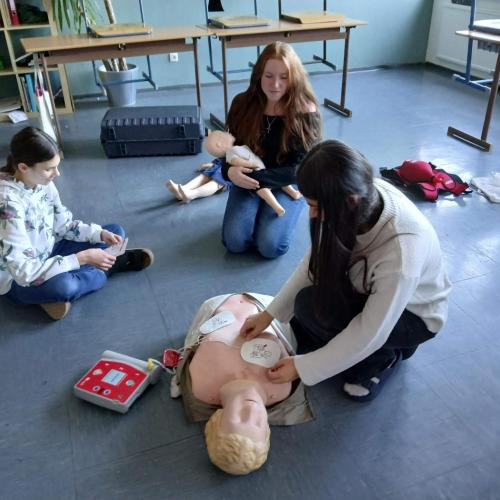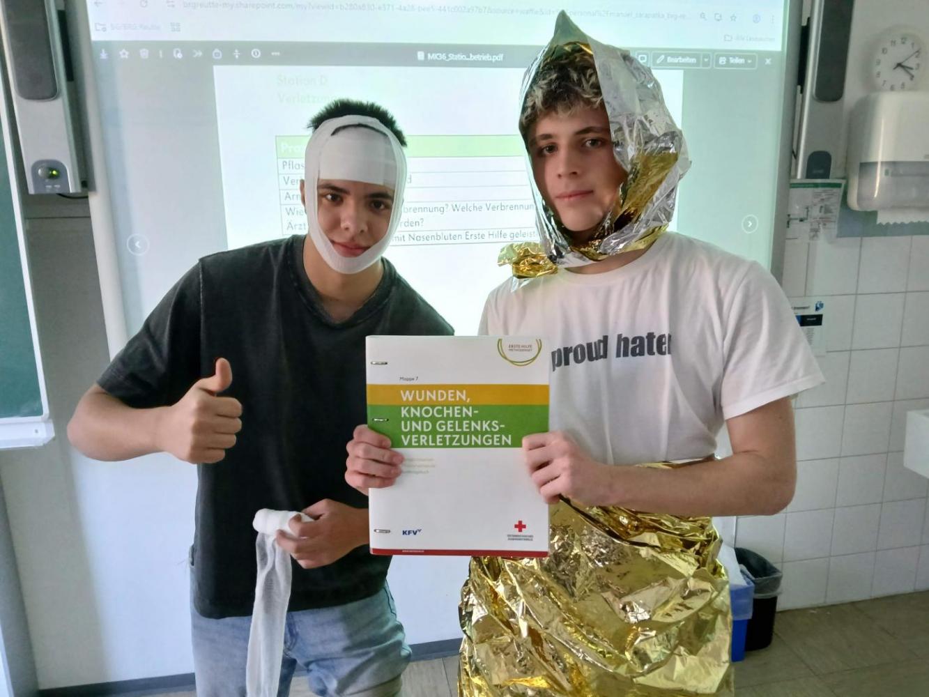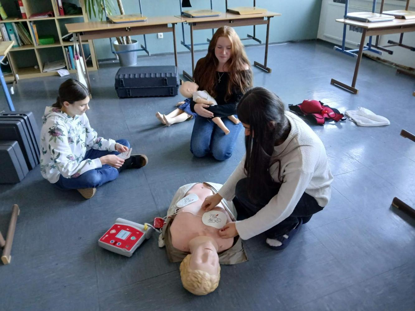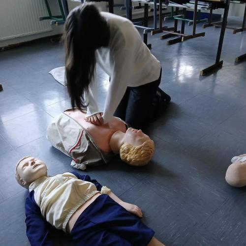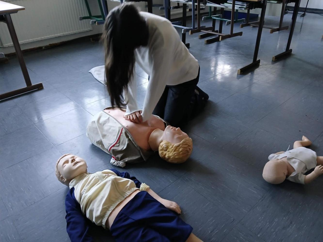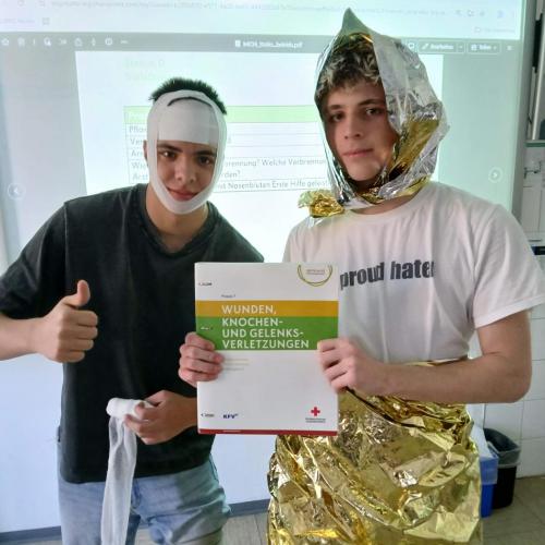 Insgesamt 25 Schüler:innen der 6. Klassen absolvieren zur Zeit den 16 Stunden Erste Hilfe Kurs. Dabei werden sie in Theorie und Praxis in der Ersten Hilfe ausgebildet. Mit der Kursbestätigung, die auch für den Führerschein angerechnet wird, haben sie danach eine wichtige Zusatzqualifikation erworben.