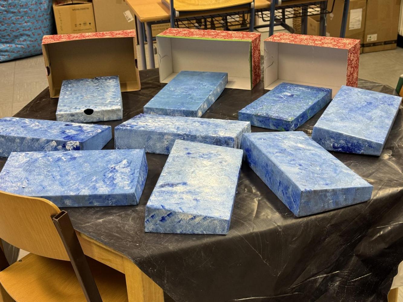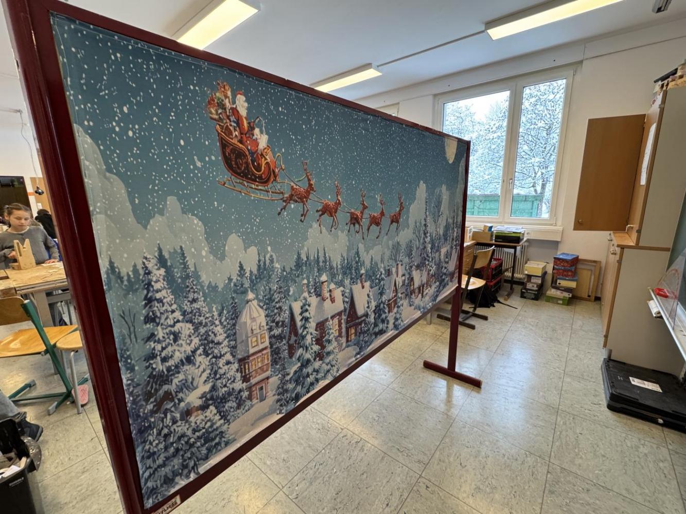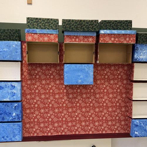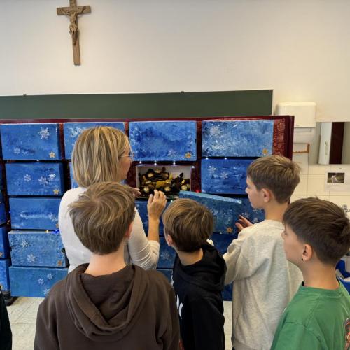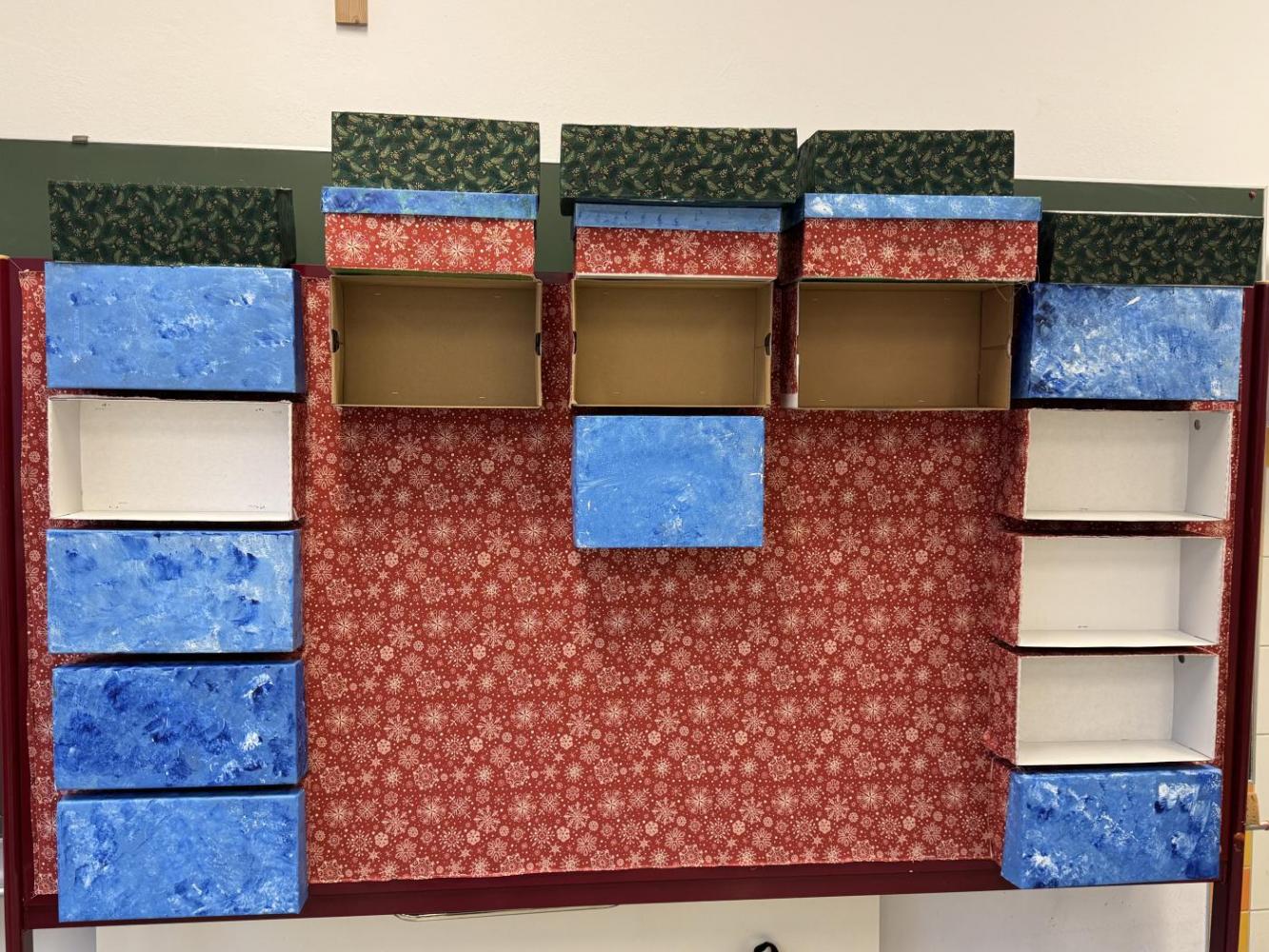 Aus einer großen Pinnwand und 24 Schuhkartons entstand ein Kalender, bei dem jede Klasse ein eigenes „Türchen“ bekommt. Nicht nur die Deckel wurden mit blauer Farbe bemalt. Unsere Schüler hatten sichtlich Freude an den Wolken-Türchen.