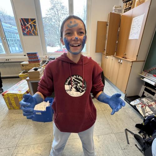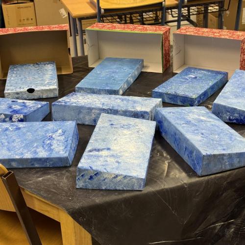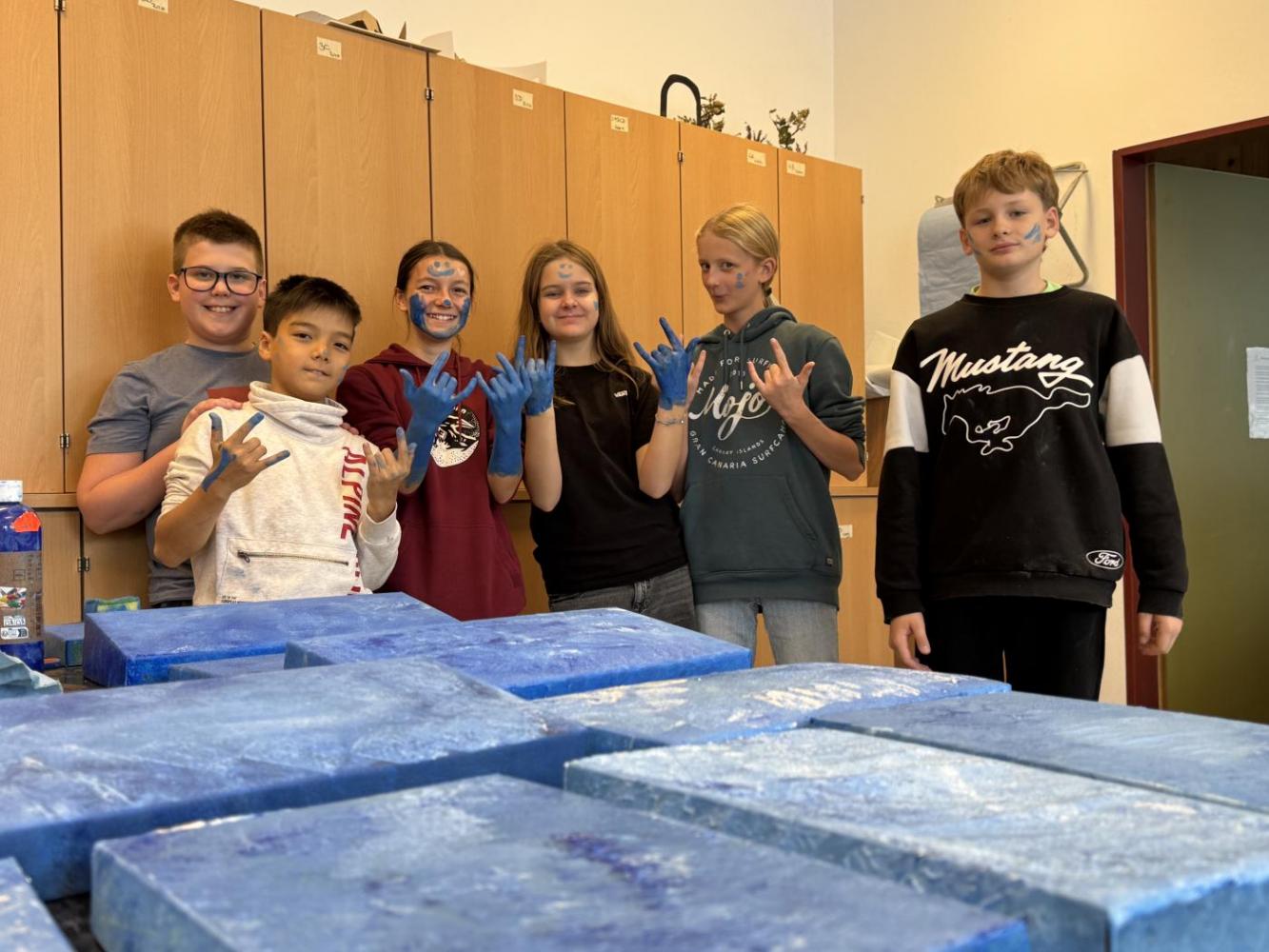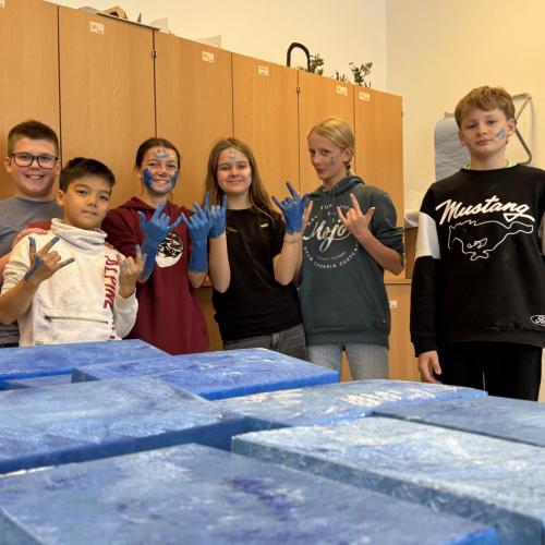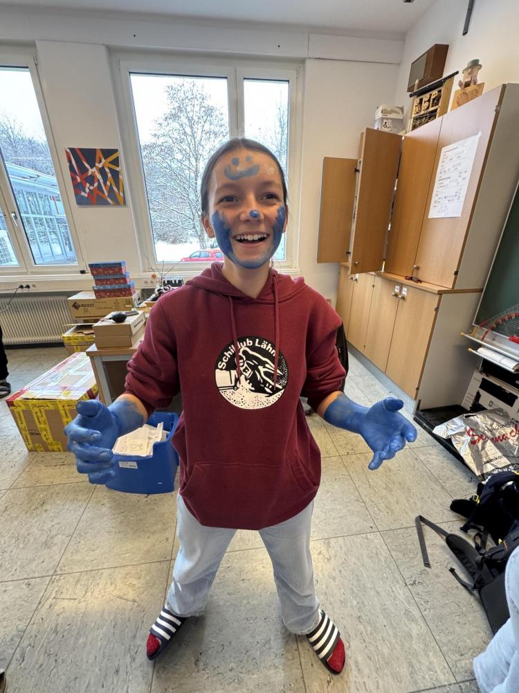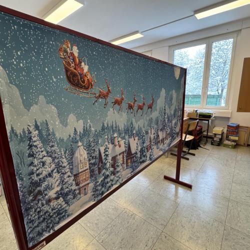 Aus einer großen Pinnwand und 24 Schuhkartons entstand ein Kalender, bei dem jede Klasse ein eigenes „Türchen“ bekommt. Nicht nur die Deckel wurden mit blauer Farbe bemalt. Unsere Schüler hatten sichtlich Freude an den Wolken-Türchen.
