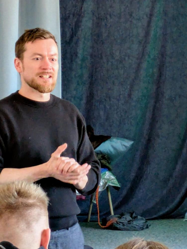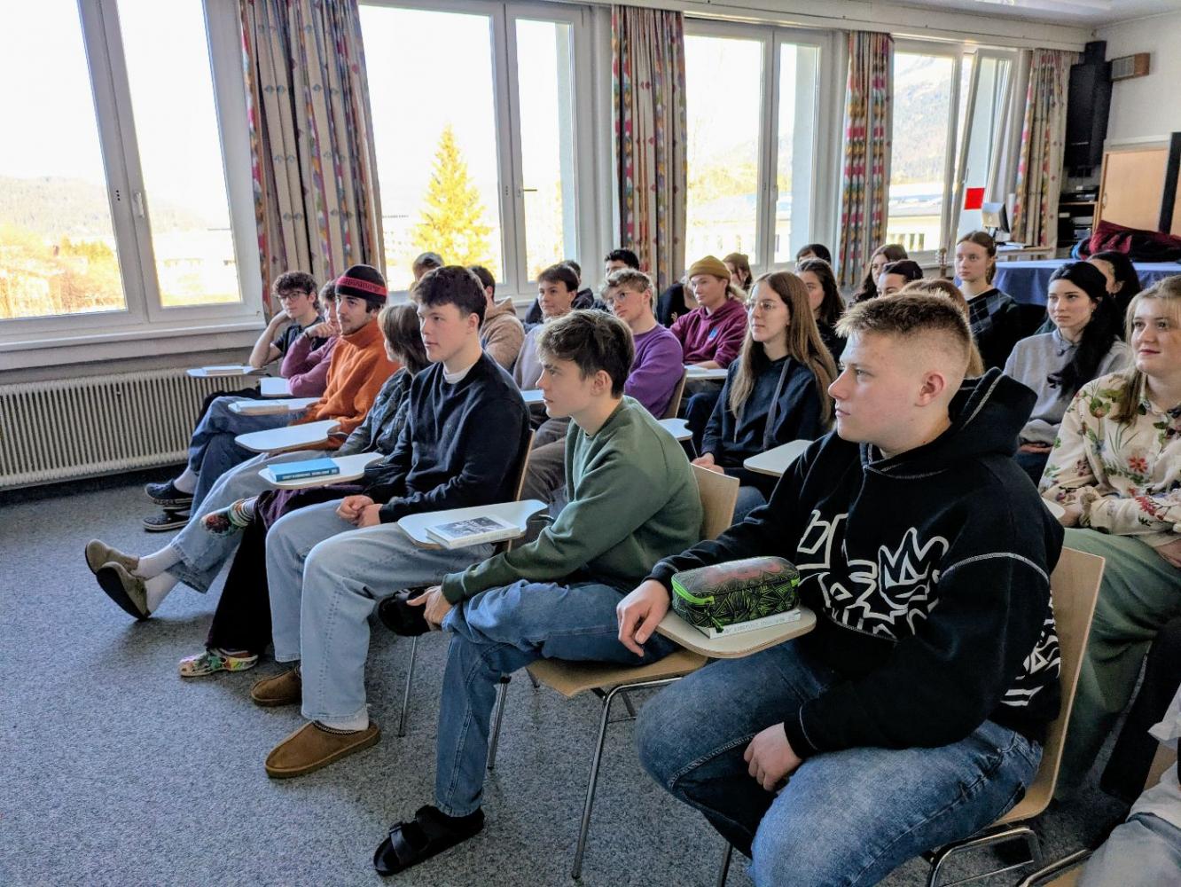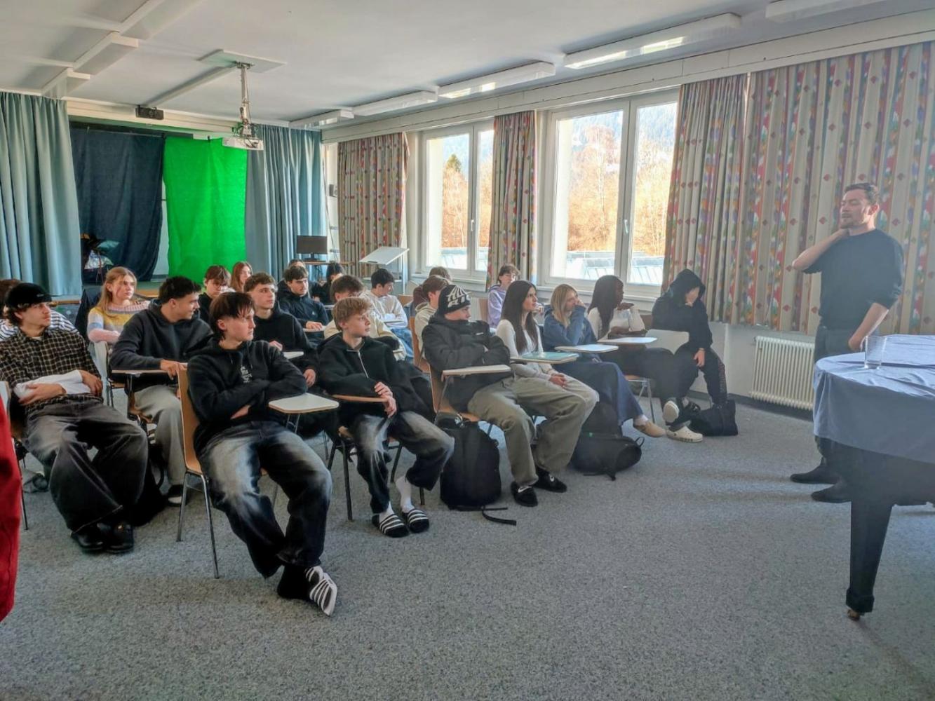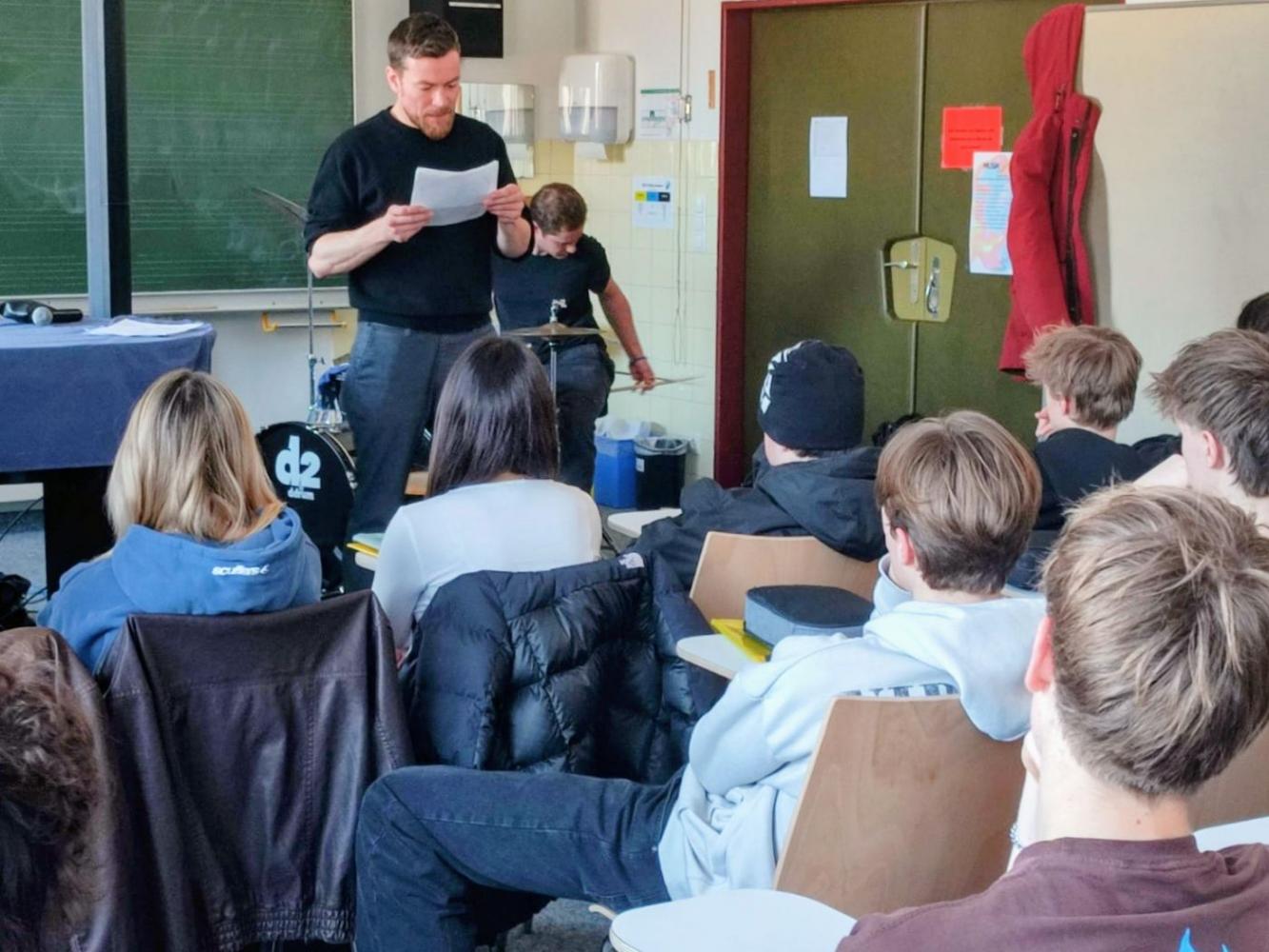Bereits im November erlebten die Schüler:innen der 8. Klassen und der 6a-Klasse den gemeinsamen Auftritt des Autors und des Schlagzeugers auf der Bühne des Tiroler Landestheaters.