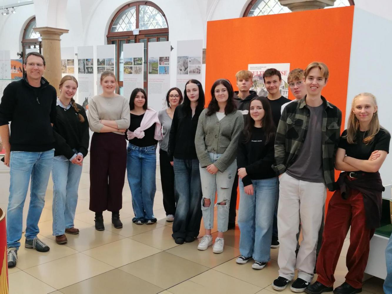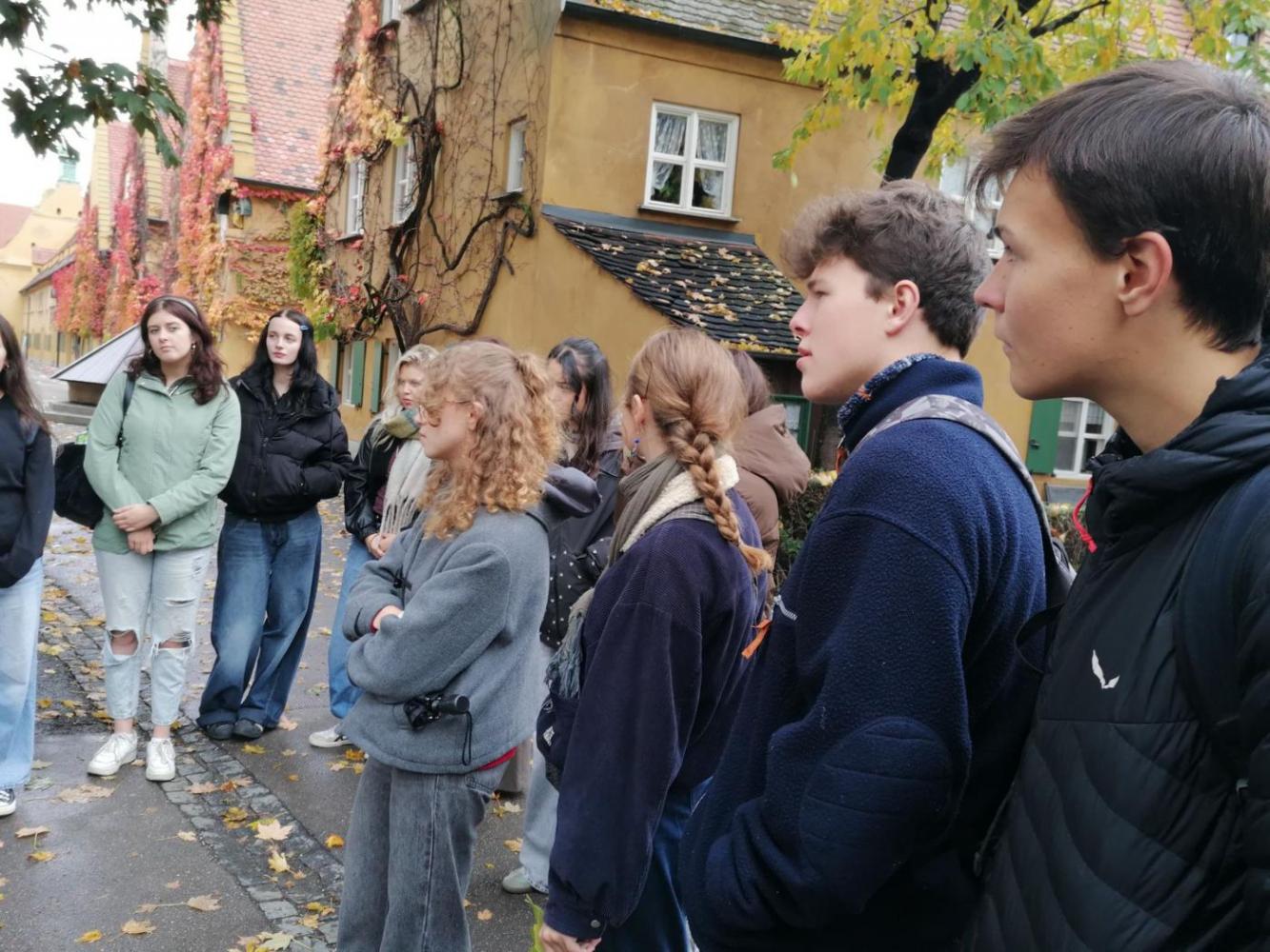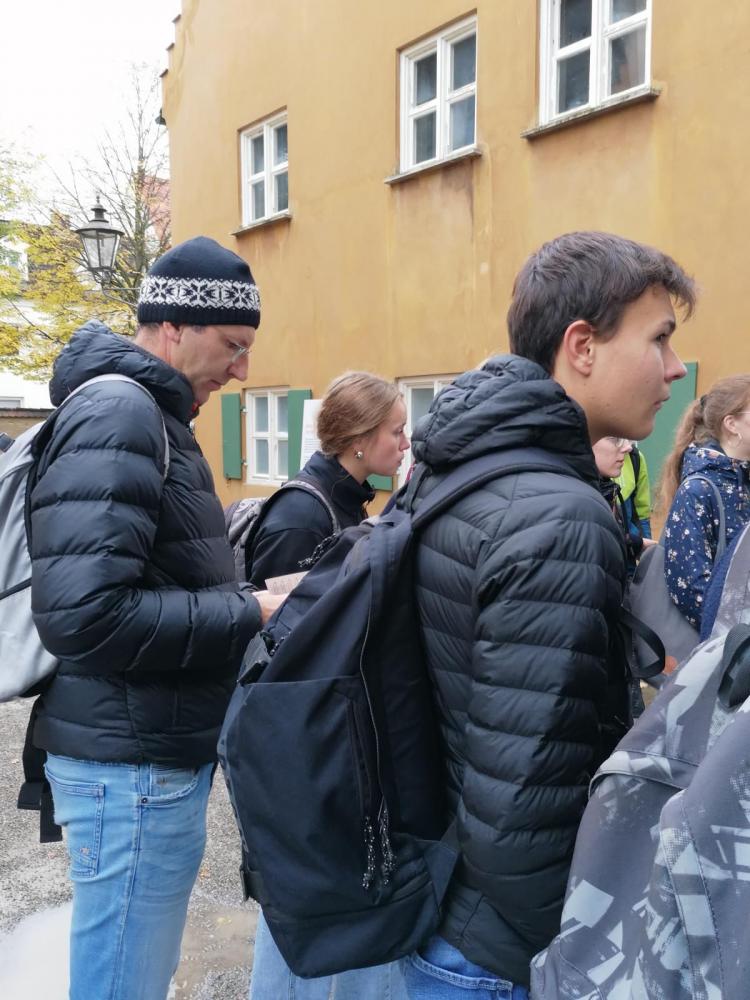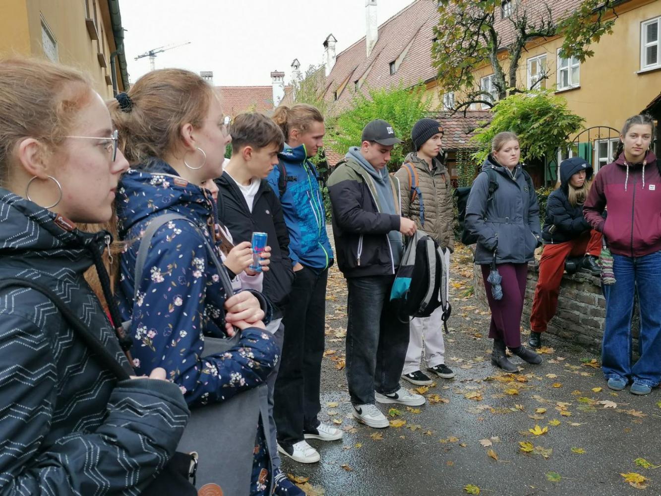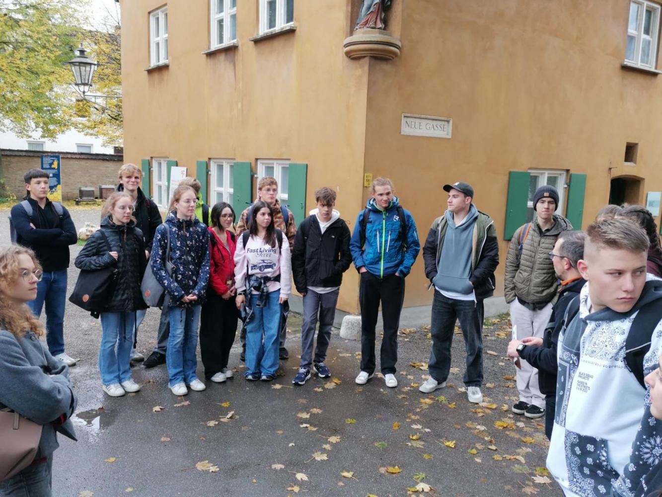 Der erste Besuch galt dem Römischen Museum, in dem wir in zwei Gruppen eine Führung durch die Exponate zu den Themen Stadtgründung, Handel, Militär, Alltagsleben und Religion erhielten. Dann besuchten wir die Fuggerei, die vom Augsburger Kaufmann Jakob Fugger (+1525) gegründete älteste Sozialsiedlung der Welt. Heute leben dort ca. 150 Ausgburger:innen aller Generationen –für drei Gebete für den Stifter und 0,88€ Jahresmiete. In einer Schauwohnung, im Bunker aus dem 2. Weltkrieg und in einer Videopräsentation, in der Bewohner:innen aus ihrer Lebensgeschichte erzählen, erhielten wir einprägsame Eindrücke über diesen besonderen Stadtteil. Nach einem kurzen Stopp vor dem Geburtshaus von Bert Brecht (mit einem knappen Überblick über sein Leben und Werk) ging es weiter zum Rathausplatz, wo das Rathaus, der (eingerüstete) Perlachturm sowie der Augustus-Brunnen besichtigt wurden. Auf dem Weg zum Bahnhof besuchten wir den Anna-Hof , wo im 16. Jh. (Kirchen-)Geschichte geschrieben wurde: Martin Luther hielt sich hier 1511 auf seiner Rückreise von Rom kurz auf und 1518 verbrachte er hier drei Wochen, um mit dem päpstlichen Gesandten Cajetan über Glaubensfragen zu diskutieren.