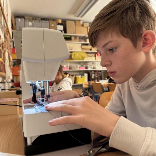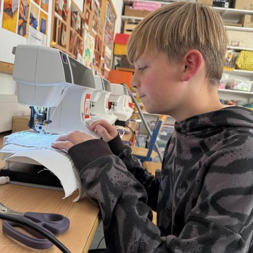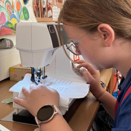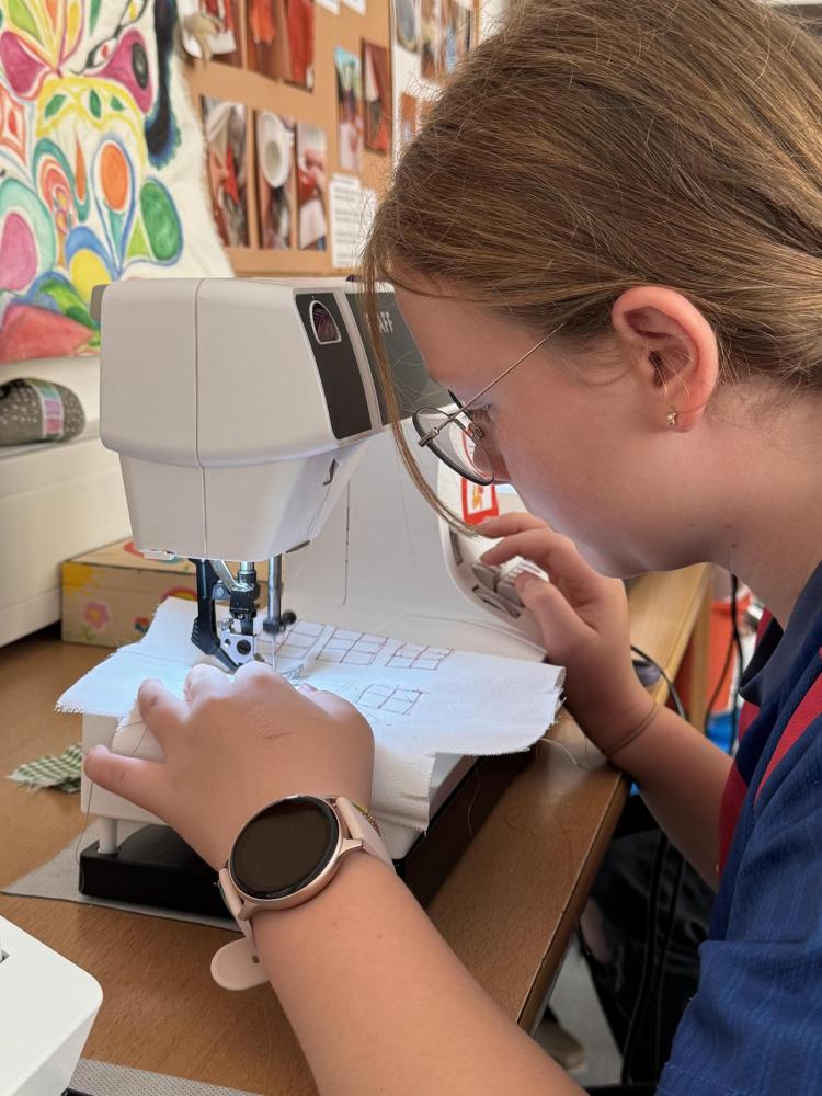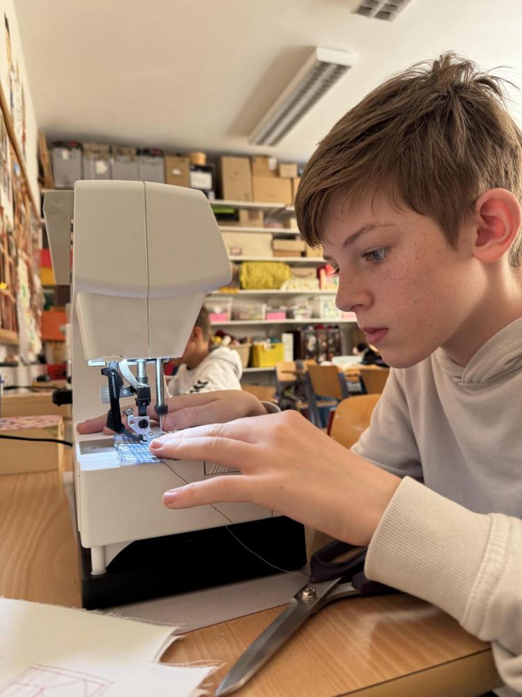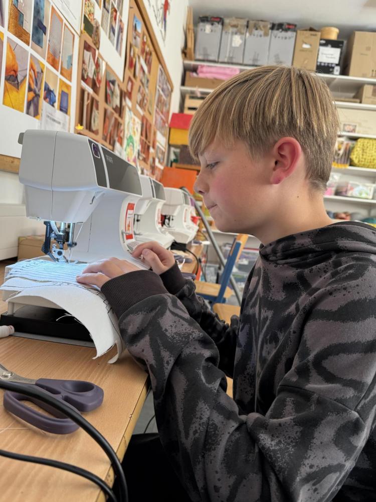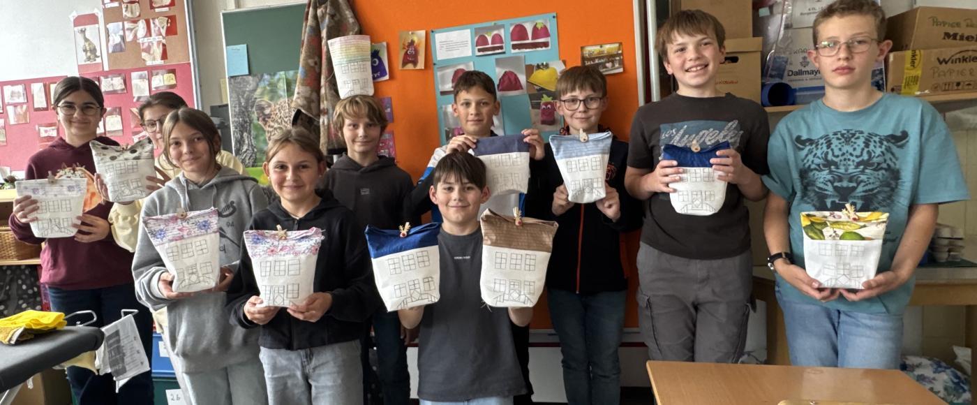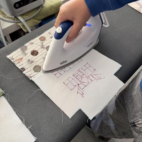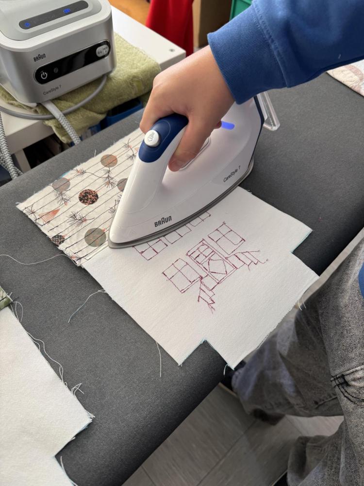 Als Grundmaterial dient ein stabiler, weißer Stoff, auf dem mit der Nähmaschine Fenster, Türen und Treppen gesteppt wurden. Die Dächer bestehen aus farbigen Stoffen und sind mit Linien genäht, wodurch sie eine schöne Struktur und Stabilität erhalten.