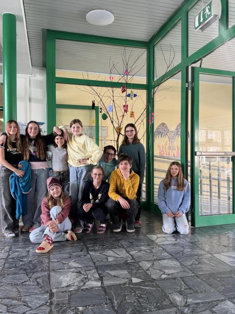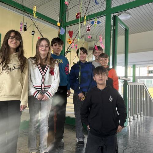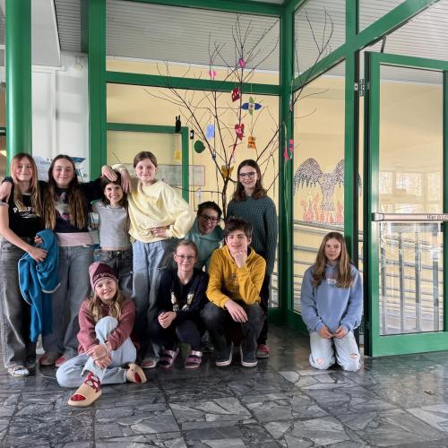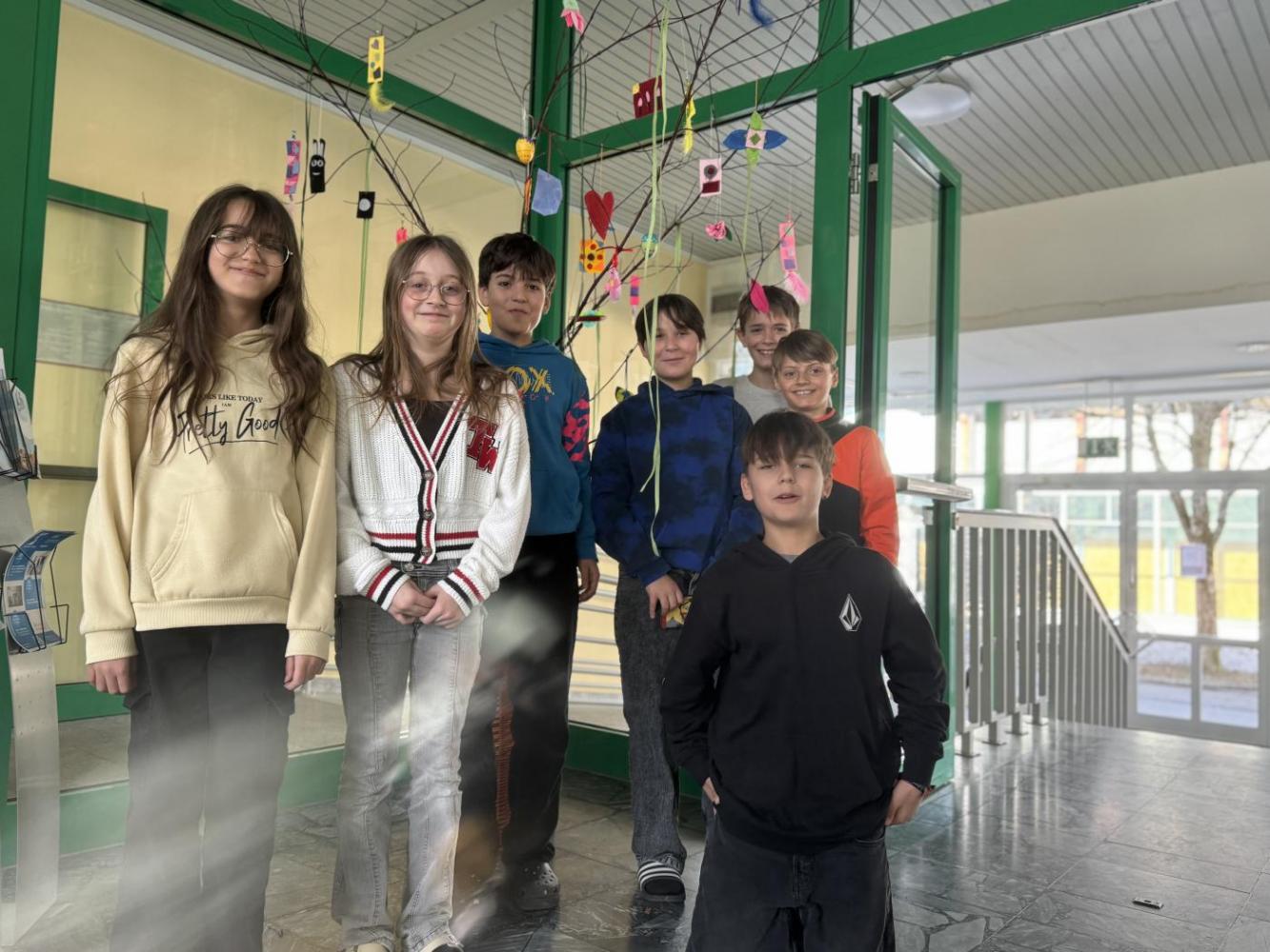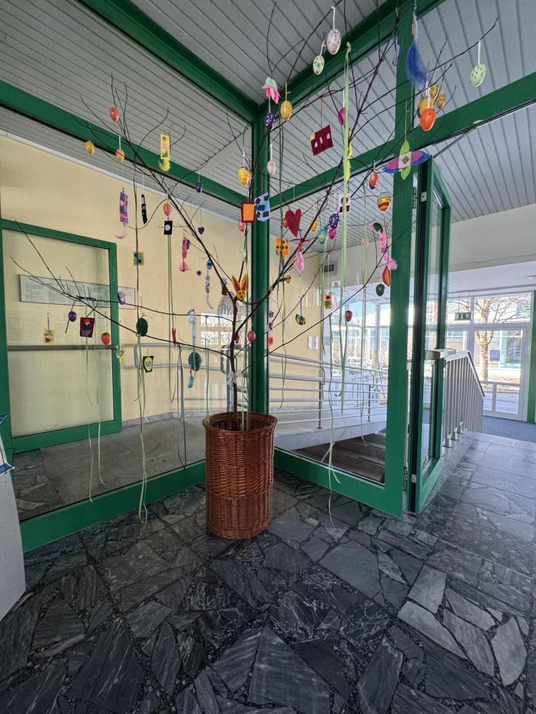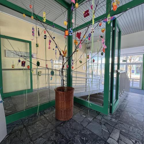 Gemeinsam haben die Schülerinnen und Schüler einen Osterbaum gestaltet, der nun unseren Eingangsbereich schmückt. Als Baum dient ein großer Ast, der bunt dekoriert wurde.