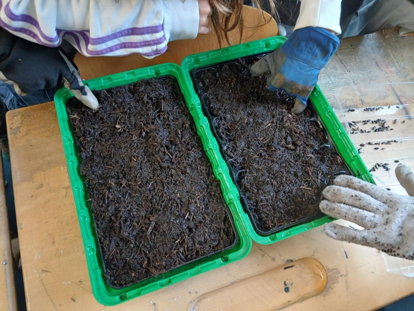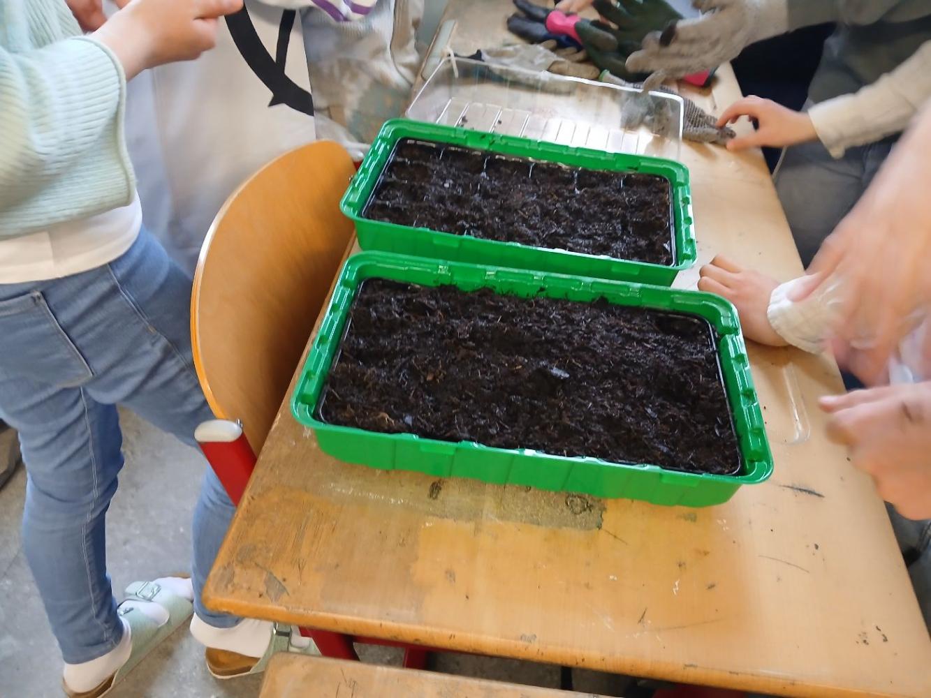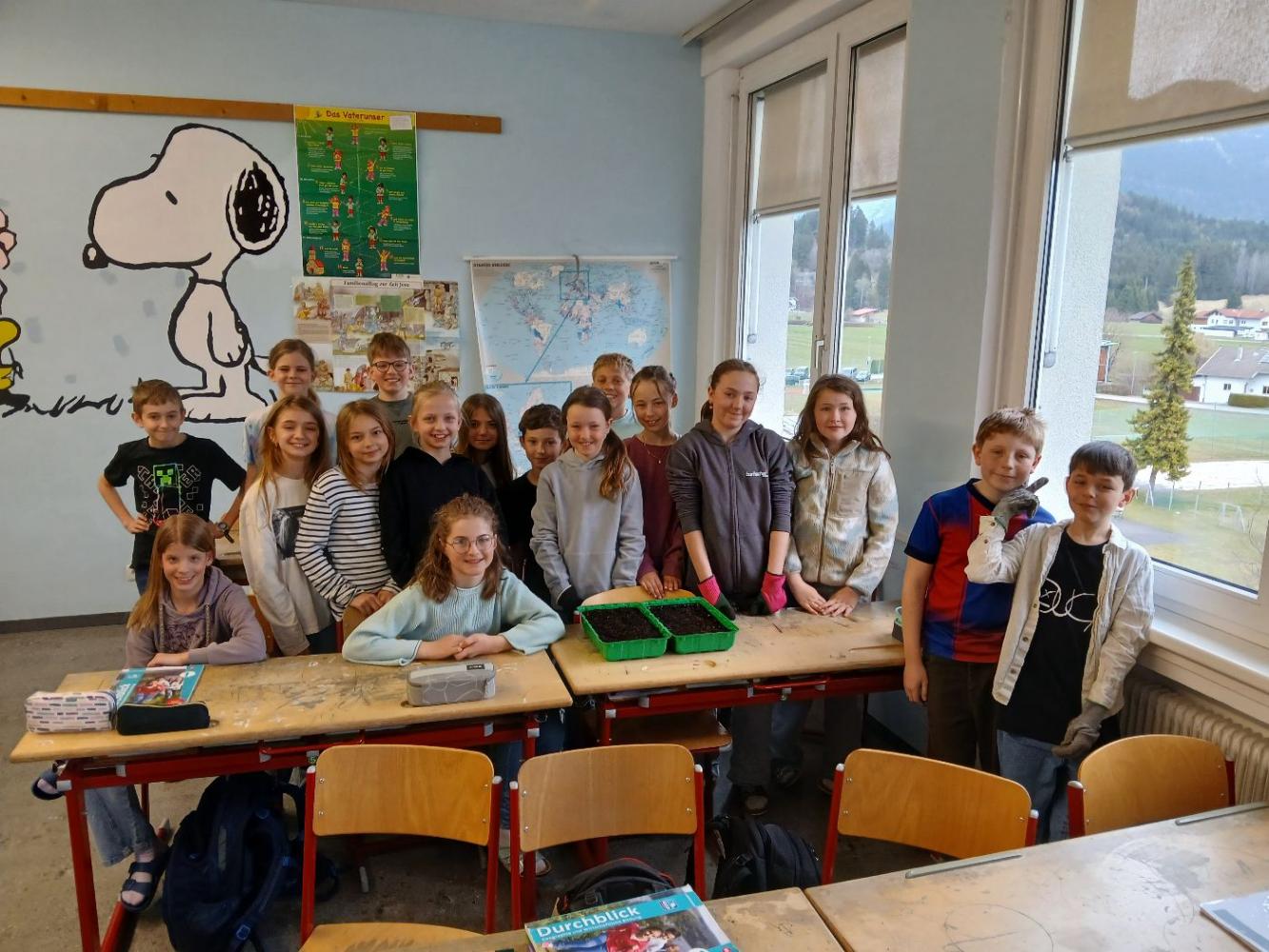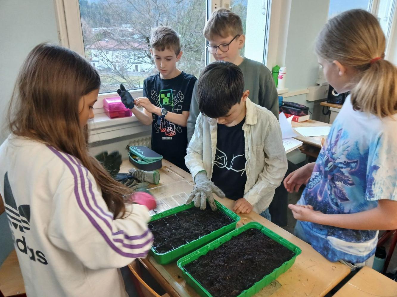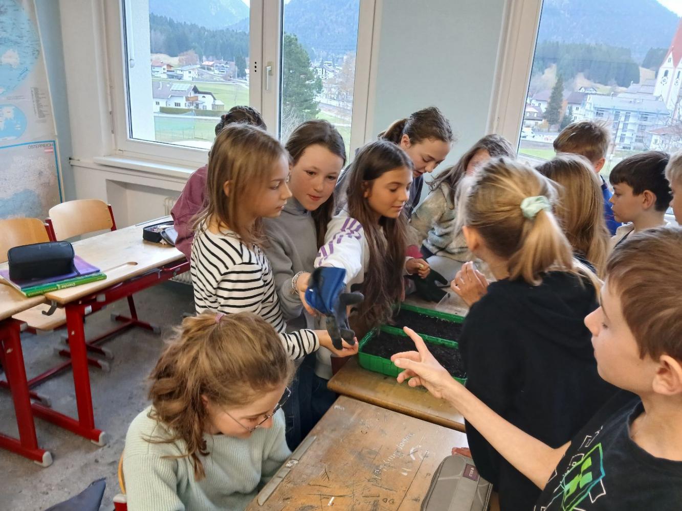 Die jungen Forscher:innen pflanzten fleißig Sonnenblumenkerne und beobachten täglich, ob die Schale mit Plastikabdeckung schneller die Pflanzen wachsen lässt, oder jene Pflanzschale ohne Abdeckung. Die Kinder achten auf genügend Licht, Wasser und Wärme und lernen wie sensibel ein System bereits im Kleinen ist.