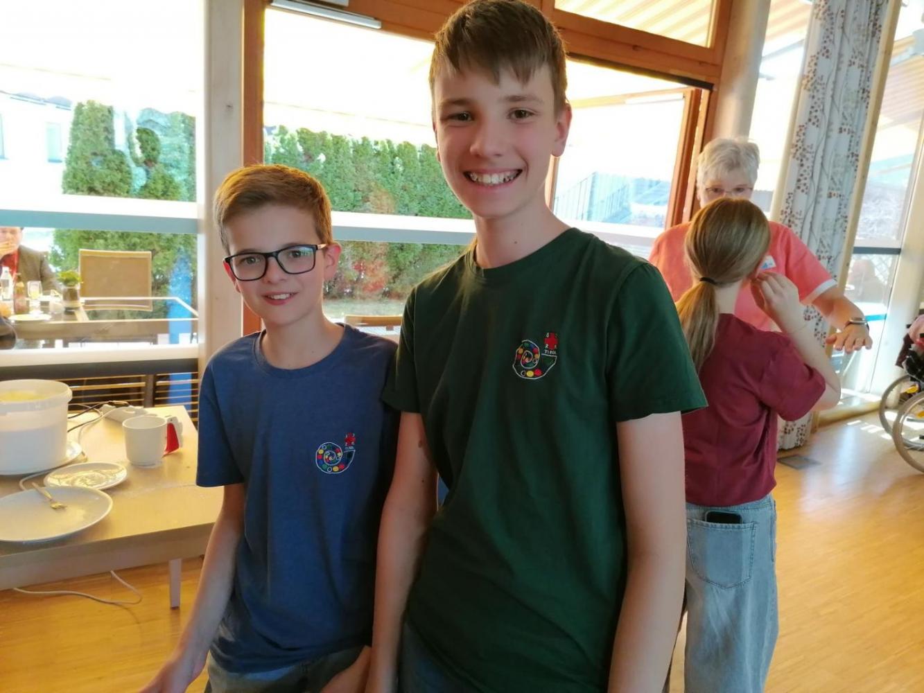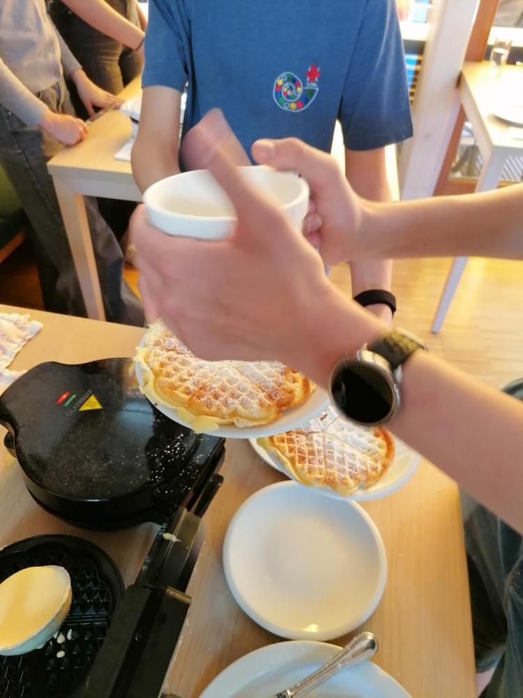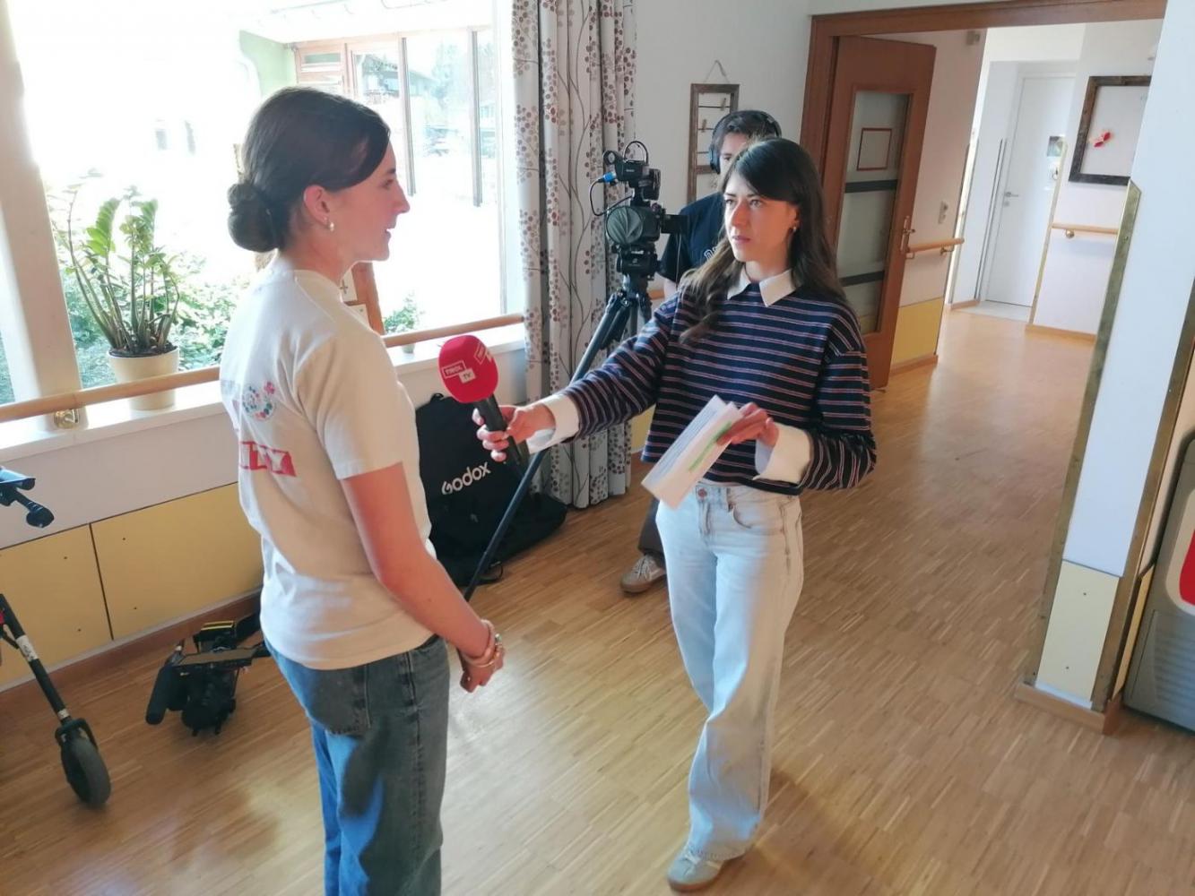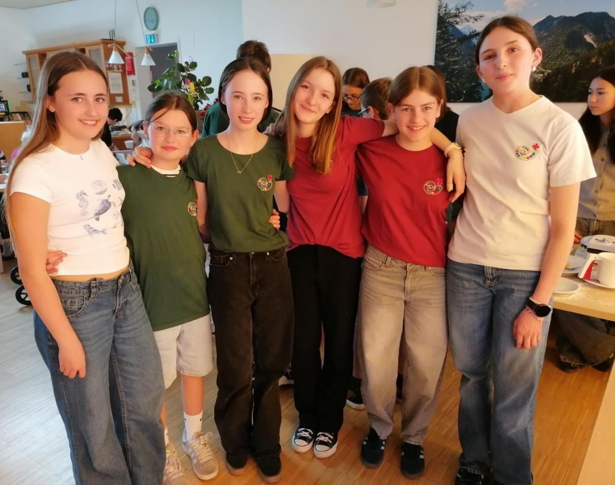 Auf Einladung und Anregung von Evi Keller (Freiwilligenzentrum Reutte) veranstaltete die Jugendrotkreuzgruppe am 24. April einen Waffelnachmittag für die Bewohner:innen des Seniorenzentrums. Pünktlich um 14 Uhr wurden die Waffeleisen eingeschaltet und der vom Küchenteam vorbereitete Waffelteig wurde in Form gegossen. Dann wurden die frisch duftenden, fluffigen Gebäcke, mit Staubzucker und Sahne garniert, serviert. Wie gut, dass fast alle von der Gruppe da waren, denn so ging alles flott vonstatten und die Senior:innen genossen sichtlich die freundliche Bedienung. Die Aktion erhielt auch mediale Aufmerksamkeit, denn ein Kamerateam von Tirol TV erstellte einen Beitrag, in dem auch Hannah von unserer Gruppe ein Interview geben durfte. Mit großer Aufmerksamkeit verfolgten die Senior:innen nach dem Kaffee eine Präsentation über unsere Tätigkeiten im Laufe eines JRK-Jahres. Zur Erinnerung an unseren Besuch überreichten wir dem Heimleiter ein von Nora gezeichnetes und von den Gruppenmitgliedern unterschriebenes Bild, das die freundliche Begegnung dieses Nachmittags darstellt.