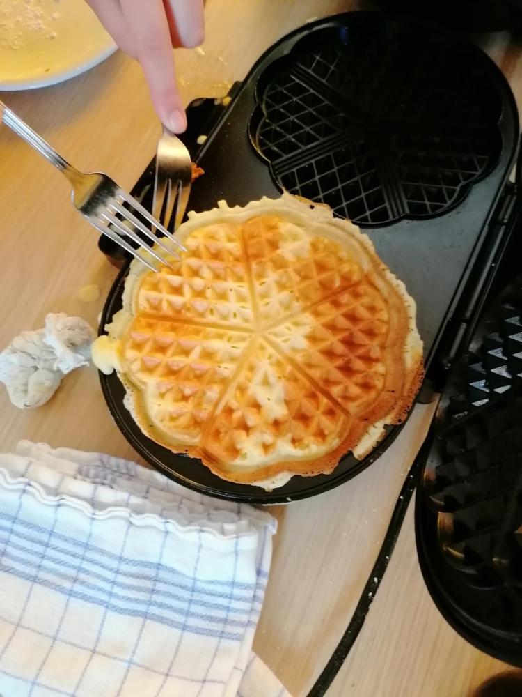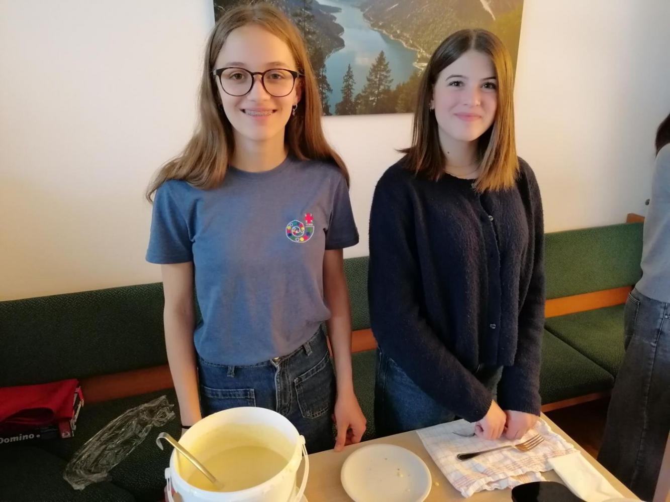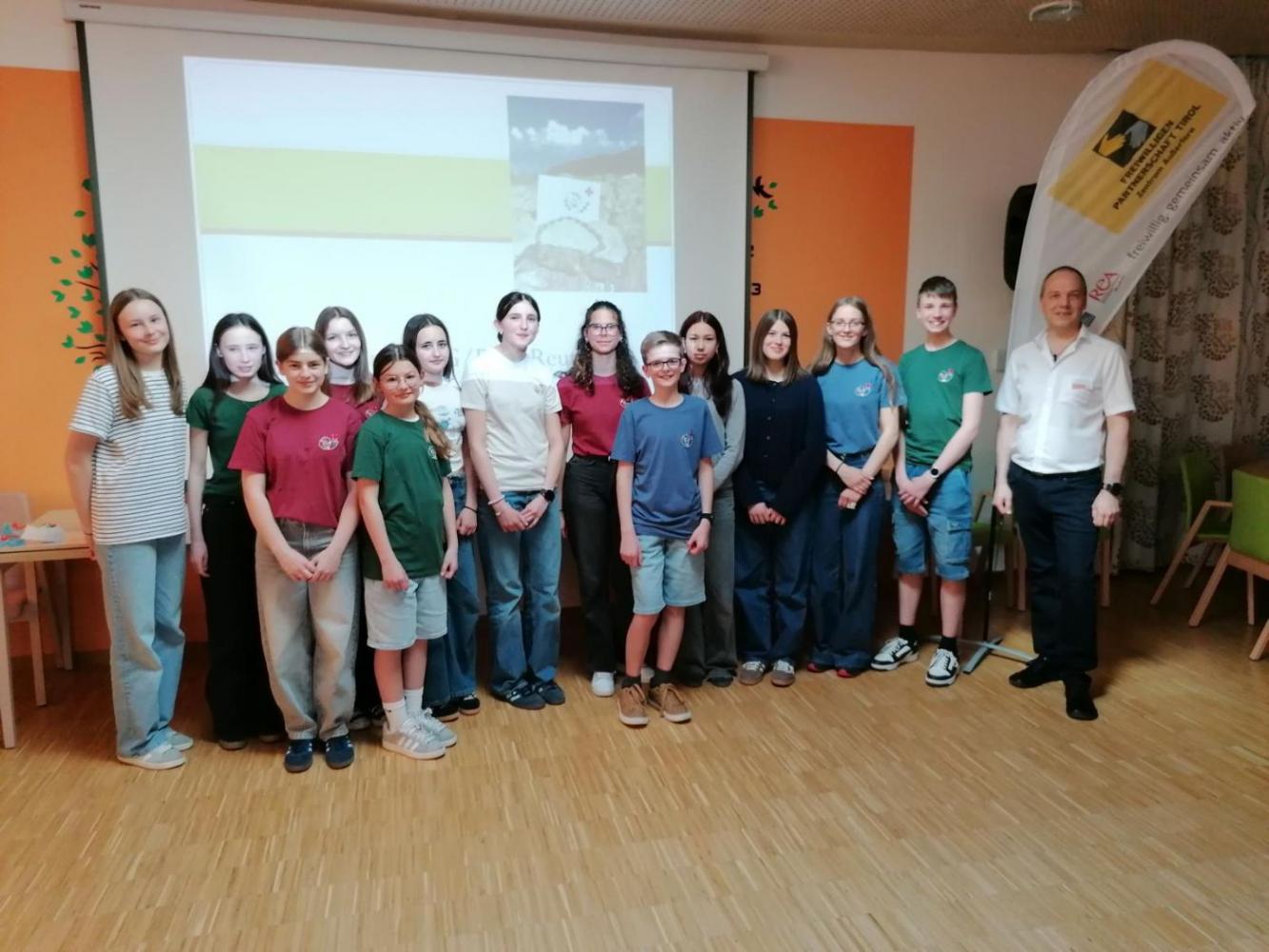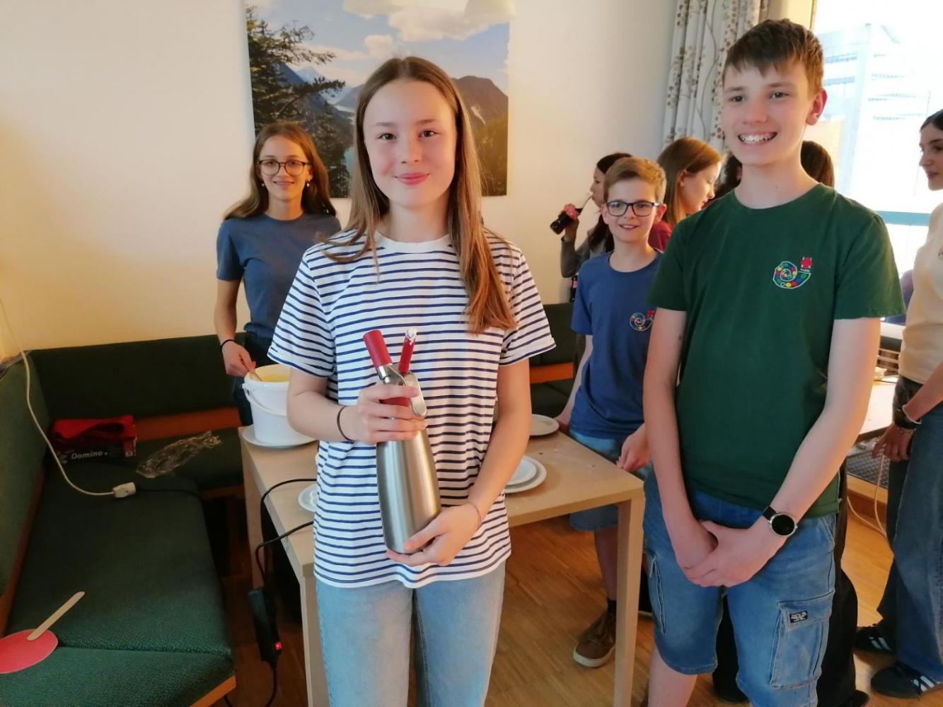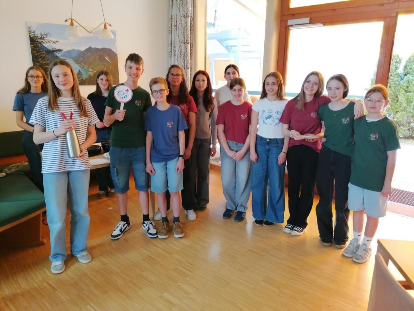 Auf Einladung und Anregung von Evi Keller (Freiwilligenzentrum Reutte) veranstaltete die Jugendrotkreuzgruppe am 24. April einen Waffelnachmittag für die Bewohner:innen des Seniorenzentrums. Pünktlich um 14 Uhr wurden die Waffeleisen eingeschaltet und der vom Küchenteam vorbereitete Waffelteig wurde in Form gegossen. Dann wurden die frisch duftenden, fluffigen Gebäcke, mit Staubzucker und Sahne garniert, serviert. Wie gut, dass fast alle von der Gruppe da waren, denn so ging alles flott vonstatten und die Senior:innen genossen sichtlich die freundliche Bedienung. Die Aktion erhielt auch mediale Aufmerksamkeit, denn ein Kamerateam von Tirol TV erstellte einen Beitrag, in dem auch Hannah von unserer Gruppe ein Interview geben durfte. Mit großer Aufmerksamkeit verfolgten die Senior:innen nach dem Kaffee eine Präsentation über unsere Tätigkeiten im Laufe eines JRK-Jahres. Zur Erinnerung an unseren Besuch überreichten wir dem Heimleiter ein von Nora gezeichnetes und von den Gruppenmitgliedern unterschriebenes Bild, das die freundliche Begegnung dieses Nachmittags darstellt.