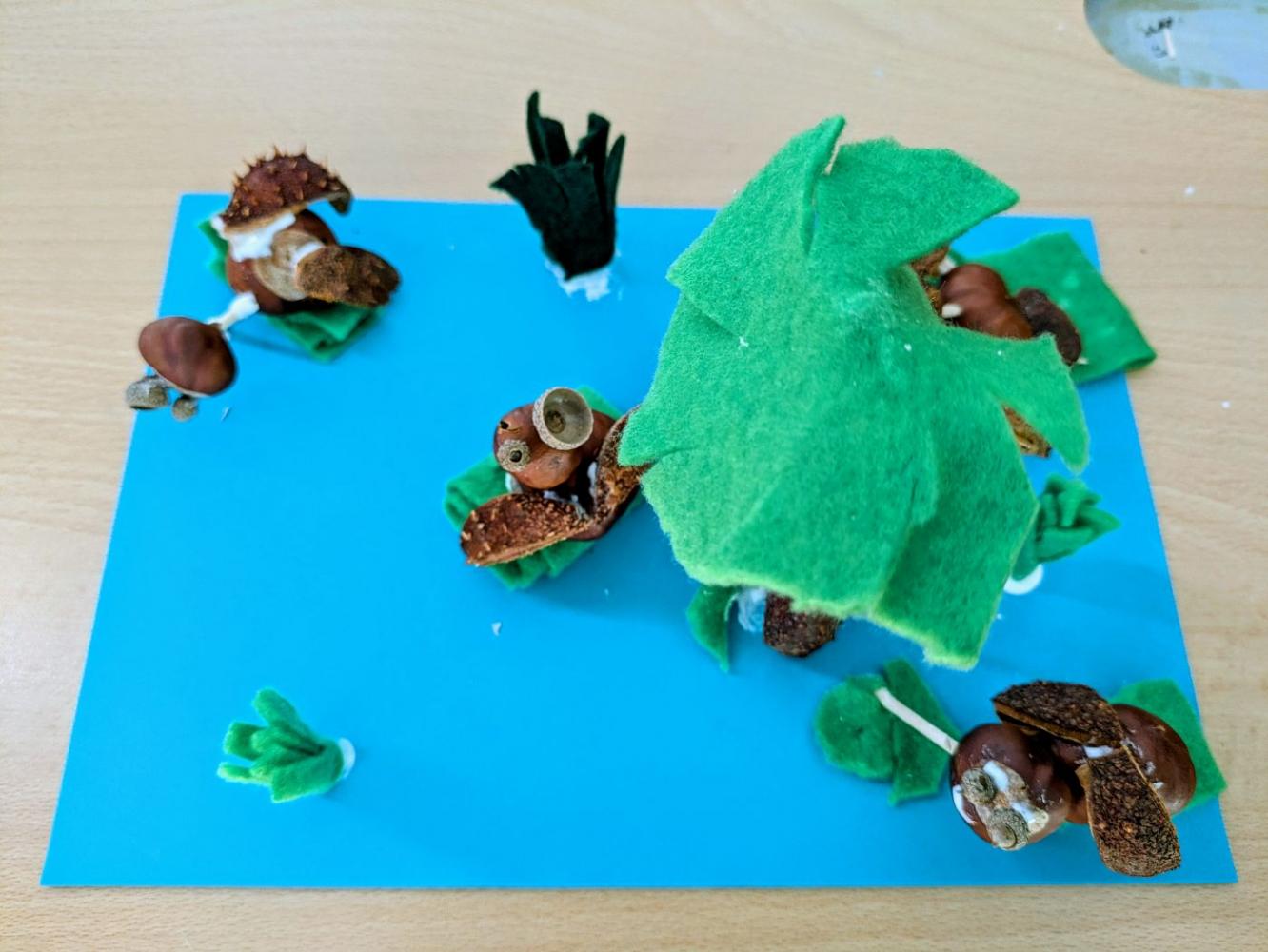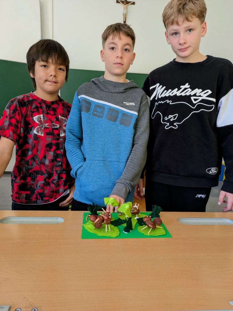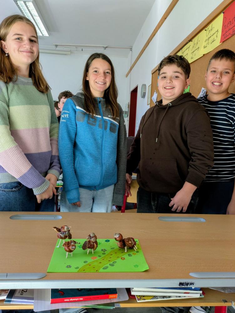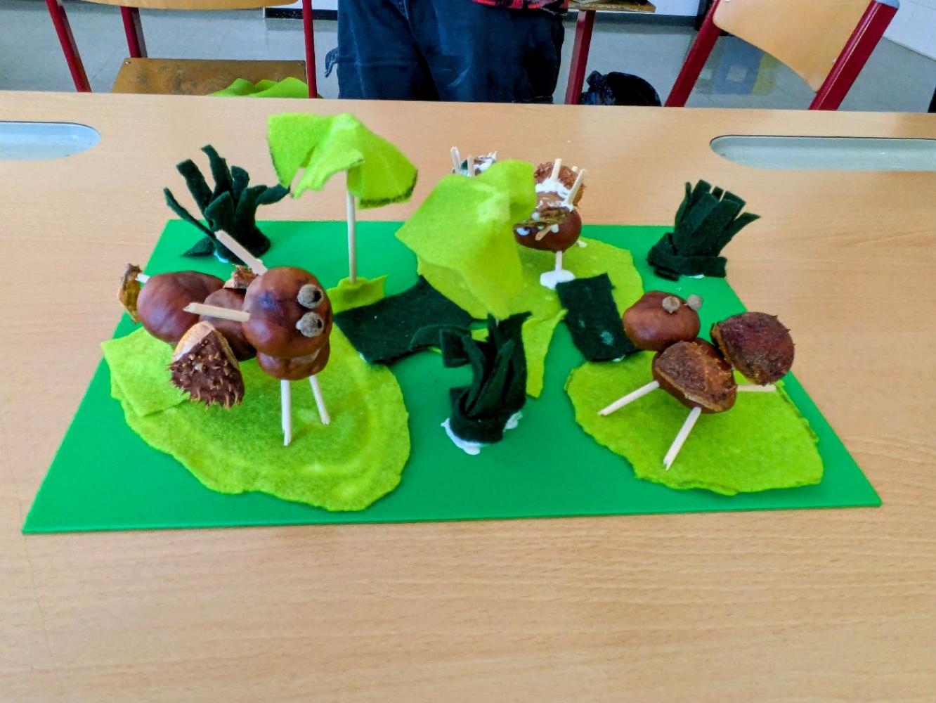 Am Beginn der Bastelarbeit steht eine Anleitung. Diese ist kurz, Hinweise auf Schwierigkeiten und hilfreiche Tipps fehlen. Es passiert, was zu erwarten ist: Die fertigen Kastaniendrachen unterscheiden sich stark. Es sind Flugdrachen, liegende Drachen, stehende Drachen, Drachen mit Füßen, Drachen mit Radar und noch viele andere Drachen entstanden.